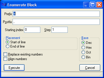 For more information on enumerating text please refer to the Enumerate Text topic in the section entitled "Working with Code Roar". The following figure shows the Enumerate Text dialog: