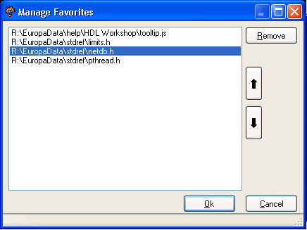 The Manage Favorites dialog allows the user to manage the availability and ordering of favorite files displayed in the favorites menu. It does not impact the ordering of files displayed in the Favorites panel.