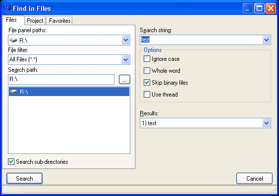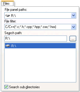 The Files tab shown below is used to search across files located on the hard disk or on a network drive.