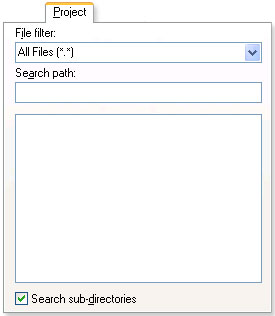 The Project tab allows the user to search for a particular string within the set of files contained in the active project. The search begins from the specified project directory and may include project sub-directories. Only files within the current project can be searched using this option. Refer to the Project tab section below for more information. |