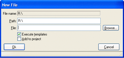 The New File dialog allows the user to create a new file. It allows the user to optionally execute a template associated with the file type when the new file is created.