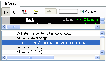 Displays a preview of the location where the search text was found so that the file does not have to be opened in the editor. |