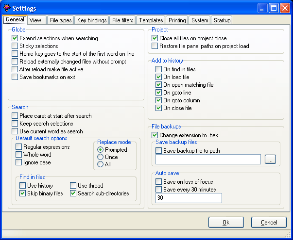 The General tab allows the user to configure settings for general topics such as searching, history, file backups, etc. |