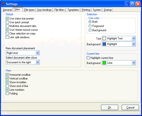The View tab of the Settings Dialog allows the user to control the display of certain visual elements of Code Roar.